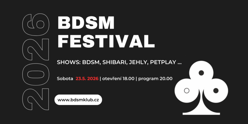 Máme pro Vás tu správnou akci. Na 23. 5. 2026 jsme přichystali BDSM festival. Těšit se můžete na spanking, bondage, dlouhý bič, jehly, burlesku, petplay a další. Jednotlivé vystoupení představíme později.